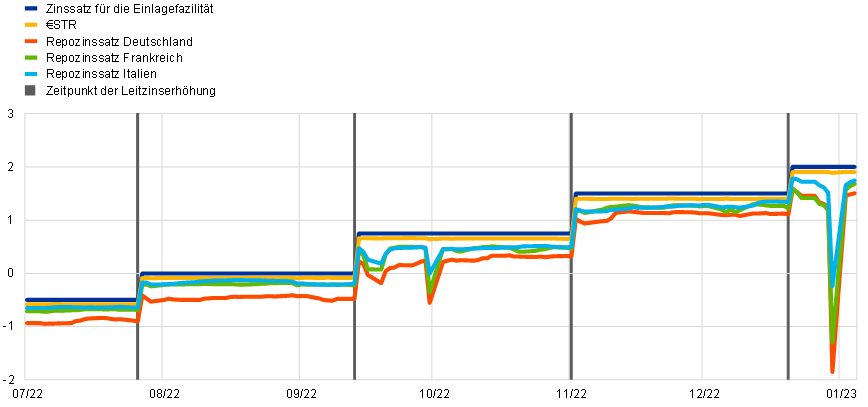 Daher kündigten wir nach unserer letzten geldpolitischen Sitzung des Jahres im Dezember an, dass die Zinsen noch deutlich und in gleichmäßigem Tempo steigen müssen, damit sie ein ausreichend restriktives Niveau erreichen, das eine zeitnahe Rückkehr der Inflation zu unserem Zielwert gewährleistet. Gleichzeitig wiesen wir darauf hin, dass die EZB-Leitzinsen zwar unser wichtigstes Instrument bei der Festlegung des geldpolitischen Kurses sind, dass wir aber die APP-Wertpapierbestände ab März 2023 in einem maßvollen und vorhersehbaren Tempo reduzieren werden. Dem war ein Beschluss im Oktober vorausgegangen, die Bedingungen der dritten Reihe unserer gezielten längerfristigen Refinanzierungsgeschäfte (GLRG III) zu rekalibrieren. Durch die Rekalibrierung wurden Hinderungsgründe für eine freiwillige vorzeitige Rückzahlung ausstehender GLRG-III-Mittel beseitigt. Zwischen Ende Juni (als der Nettoerwerb von Vermögenswerten auslief) und Ende Dezember reduzierten sich die zu geldpolitischen Zwecken gehaltenen Wertpapiere in unserer Bilanz um rund 830 Mrd. €, was zur Normalisierung unserer Bilanz beitrug.