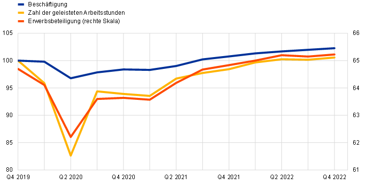 Im Zuge der wirtschaftlichen Belebung im Euroraum erholte sich der Arbeitsmarkt weiter spürbar von der Pandemie. Im vierten Quartal 2022 übertrafen die Gesamtbeschäftigung und die Zahl der insgesamt geleisteten Arbeitsstunden die entsprechenden Werte vom vierten Quartal 2019 um 2,3 % bzw. 0,6 % (siehe Abbildung 1.6). Die Erwerbsbeteiligung in der Altersgruppe der 15- bis 74-Jährigen erhöhte sich im vierten Quartal auf 65,2 %. Sie lag damit 0,5 Prozentpunkte über ihrem Stand vom Schlussquartal 2019. Im Einklang mit dem Beschäftigungswachstum sank die Arbeitslosenquote weiter von einem bereits historisch niedrigen Niveau von 6,9 % im Januar 2022 auf 6,7 % Ende 2022 (siehe Abbildung 1.7). Programme zur Arbeitsplatzsicherung, durch die sich Entlassungen während der Krise in Grenzen gehalten hatten, wurden weniger stark in Anspruch genommen. Die an den Programmen teilnehmenden Arbeitskräfte kehrten weitgehend wieder zu ihren normalen Arbeitszeiten zurück.