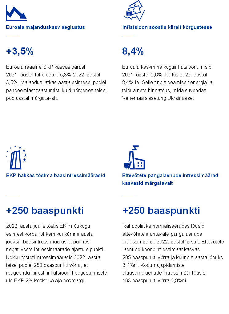 Maailmamajanduse kasv aeglustus 2022. aastal. Venemaa sissetung Ukrainasse, kiire inflatsioon ja karmimad rahastamistingimused rõhusid nii arenenud majandusega kui ka tärkava turumajandusega riike. Üleilmne inflatsioonisurve kasvas kõrgete ja volatiilsete toormehindade, üleilmsete tarneraskuste ning tööturu pingelise olukorra tõttu märkimisväärselt. Euro nõrgenes USA dollari, kuid kallines paljude teiste vääringute suhtes, ja seega oli euro nominaalne efektiivne vahetuskurss stabiilsem.