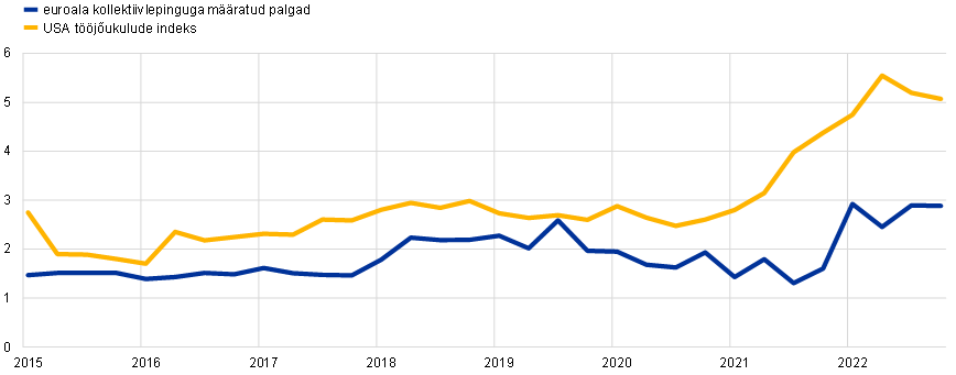 6. Vt täpsemalt EKP majandusülevaate 8/2022 täispika ingliskeelse versiooni artikli „Wage developments and their determinants since the start of the pandemic“ infokast „Comparing labour market developments in the euro area and the United States and their impact on wages“.
