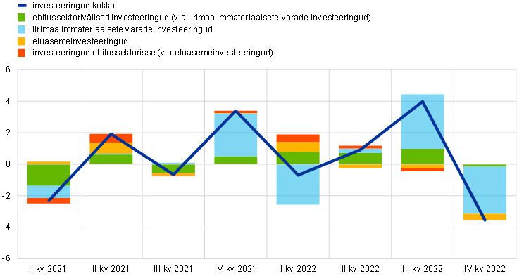 Ehitussektoriväliste investeeringute kasv – eluasemesektoriväliste erainvesteeringute võrdlusnäitaja – kõikus 2022. aastal tugevalt (joonis 1.5).[1] Kui eriti volatiilne Iirimaa immateriaalsete investeeringute komponent välja jätta,[2] aeglustus ehitussektoriväliste investeeringute kasv terve aasta jooksul. Aastat alustas see tugevalt tänu suurele nõudlusele, mis oli tingitud pandeemiapiirangute tühistamisest, ettevõtete tublile kasumile ja soodsatele rahastamistingimustele. Venemaa sõda Ukrainas ja sellele järgnenud energiakriis ning rahapoliitiliste stiimulite vähendamine kergitasid aga ettevõtete energia- ja rahastamiskulusid. Arvestades veel ka aeglustuvat omamaist ja üleilmset nõudlust ning valitsevat suurt ebakindlust, vähendas see nende motivatsiooni investeeringuid teha. Ehitussektoriväliste investeeringute tase oli 2022. aasta lõpus tublisti madalam kui 2019. aasta neljandas kvartalis, mil taset tõstis immateriaalsete varade investeeringute märgatav suurenemine. Kui Iirimaa immateriaalsete varade investeeringud välja arvata, olid ehitussektorivälised investeeringud juba 2020. aasta lõpuks taastunud. Kokkuvõttes kasvasid need 2022. aastal 5,2%.