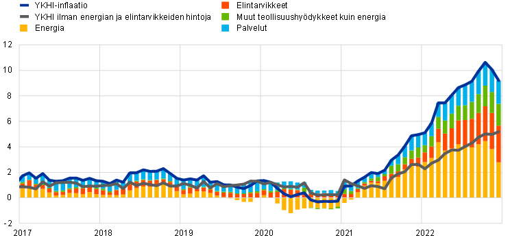 Lähteet: Euroalueen talousnäkymiä koskevat eurojärjestelmän asiantuntijoiden arviot (joulukuu 2022) ja EKP:n laskelmat.