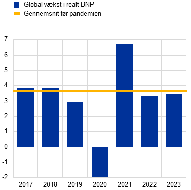 Anm.: "Globalt BNP" omfatter ikke euroområdet. Gennemsnittet før pandemien er for perioden fra 2012 til 2019. Værdierne for 2023 er estimater baseret på tilgængelige data og ECB's makroøkonomiske prognoser fra marts 2024.