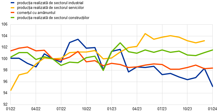 Notă: Datele privind comerțul cu amănuntul sunt exprimate în termeni reali. Cele mai recente observații se referă la decembrie 2023 pentru producția realizată de servicii, respectiv la ianuarie 2024 în celelalte cazuri.