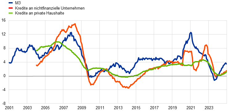 Das reale BIP im Euroraum stieg 2024 um 0,9 %, verglichen mit 0,4 % im Jahr 2023. Die vierteljährlichen Wachstumsraten waren Anfang 2024 erstmals wieder positiv, nachdem sie davor fünf Quartale in Folge stagniert hatten.