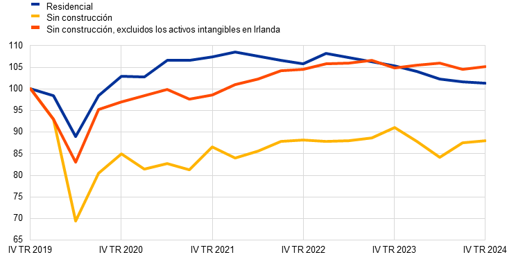 La inversión residencial cayó con fuerza en 2024 en un contexto de condiciones de financiación aún restrictivas y de debilidad de la demanda. La caída fue del 4 % con respecto a 2023, el mayor descenso interanual registrado desde 2009, durante la crisis financiera global. Esta contracción se debió sobre todo al efecto retardado del endurecimiento de la política monetaria derivado del aumento de los tipos de interés hipotecarios y del endurecimiento de los criterios de concesión de préstamos. Aunque las rentas reales se estaban recuperando y el crecimiento de los precios de los inmuebles residenciales se mantuvo débil, las restrictivas condiciones de financiación dificultaron la accesibilidad a la vivienda y deprimieron la demanda de este tipo de inmuebles. Sin embargo, dada la sólida recuperación observada en la inversión residencial tras la pandemia ―respaldada en parte por generosos incentivos fiscales (ya retirados) en Italia―, al final de 2024, esta rúbrica de inversión se mantenía un 1,3 % por encima de su nivel prepandemia, si bien mostró un comportamiento peor que el consumo privado (3,1 %) y la inversión sin construcción (5,2 %, excluidos los activos intangibles en Irlanda).