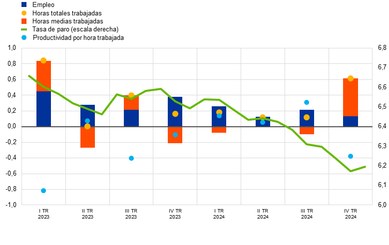 Nota: Las últimas observaciones corresponden a diciembre de 2024 para la tasa de paro y al cuarto trimestre de 2024 para el empleo, las horas totales y medias trabajadas y la productividad por hora trabajada.