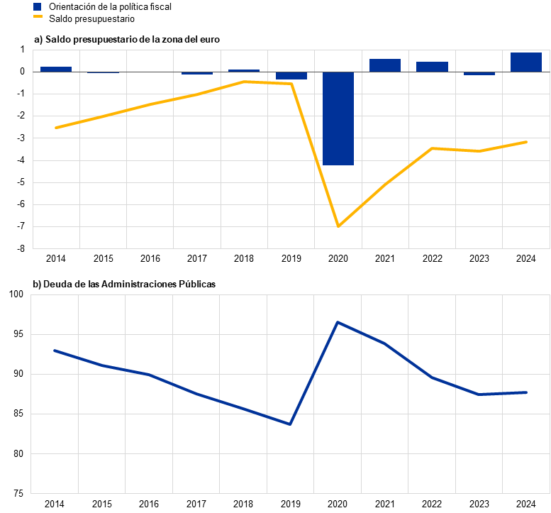 Nota: En el panel a, el indicador de la orientación de la política fiscal se ha ajustado por el lado de los ingresos a partir de 2021 excluyendo las subvenciones del Mecanismo de Recuperación y Resiliencia del NGEU porque esos ingresos no tienen efectos macroeconómicos restrictivos.