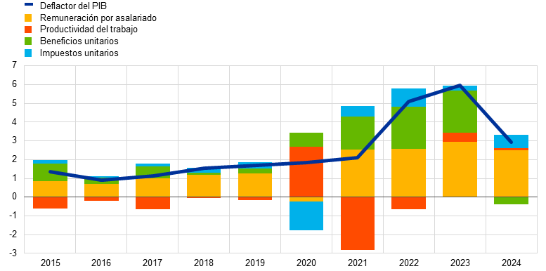 Para más información sobre el papel amortiguador de los beneficios, véase el recuadro titulado «Indicadores de márgenes para el análisis de la inflación considerando el papel de los costes totales», Boletín Económico, número 4, BCE, 2024.