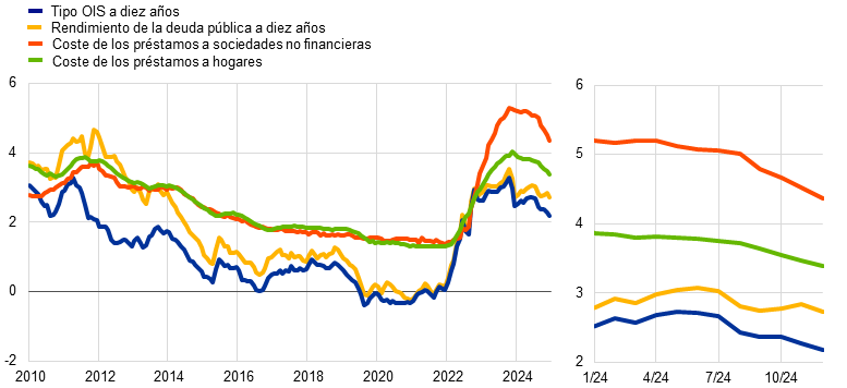 El período examinado en este informe abarca las dos últimas fases de este ciclo. A principios de 2024, el BCE estaba aún en la fase de transición, con el tipo de interés de la facilidad de depósito situado en el 4 %. En ese momento, la inflación había caído hasta el 2,9 %, lo que supone en torno a tres cuartas partes del recorrido desde su máximo. Si bien las proyecciones de nuestros expertos mostraban que la inflación retornaría a nuestro objetivo del 2 % a medio plazo en 2025, había incertidumbre sobre la persistencia de la inflación.