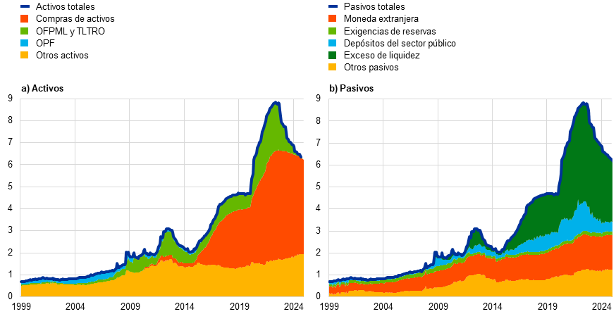 En 2024, nuestro balance también siguió normalizándose y se redujo en medio billón de euros. A final de diciembre se habían alcanzado dos hitos: el reembolso íntegro de la financiación obtenida por las entidades de crédito en el marco de la tercera serie de operaciones de financiación a plazo más largo con objetivo específico y la finalización de las reinversiones del principal de los valores adquiridos en el marco del programa de compras de emergencia frente a la pandemia que iban venciendo.