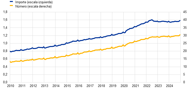 Las ratios de capital de nivel 1 ordinario (CET1) de las entidades de crédito de la zona del euro se mantuvieron próximas a su máximo histórico y se situaron en el 15,7 % en el tercer trimestre de 2024. Ello se debió a la elevada rentabilidad bancaria y al bajo nivel de préstamos dudosos. | Con un número creciente de participantes en el servicio de liquidación de pagos inmediatos de TARGET (TIPS), los pagos inmediatos en euros se incrementaron de 963.894 pagos diarios en diciembre de 2023 a 1.657.421 pagos diarios en diciembre de 2024, un aumento del 72 %. |