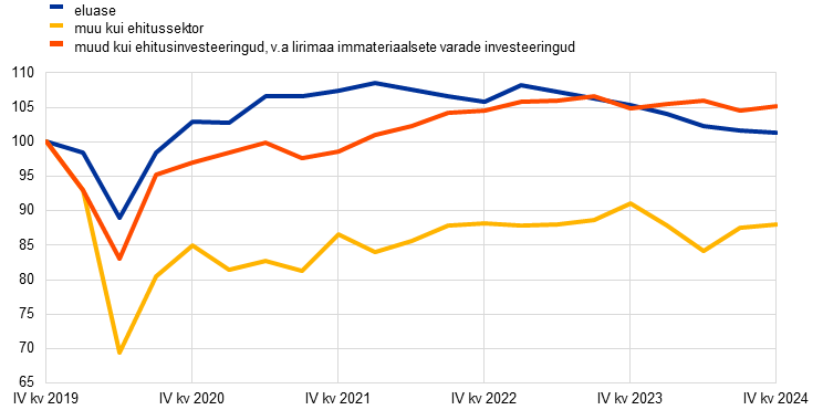 Eluasemeinvesteeringud vähenesid 2024. aastal märkimisväärselt, sest rahastamistingimused olid endiselt karmid ja nõudlus väike. Need kahanesid 2023. aastaga võrreldes 4,0%, mis on suurim aastane langus alates 2009. aasta üleilmsest finantskriisist. Vähenemine oli peamiselt tingitud rahapoliitika karmistamise viibinud mõjust, mille põhjustas hüpoteeklaenude intressimäärade tõus ja pankade laenutingimuste karmistamine. Kuigi reaalsed sissetulekud olid taastumise teel ja eluasemehindade kasv oli tagasihoidlik, piirasid karmid rahastamistingimused eluasemete taskukohasust ning vähendasid nõudlust elamukinnisvara järele. Arvestades aga eluasemeinvesteeringute jõulist pandeemiajärgset taastumist, mida osaliselt toetasid (nüüdseks lõppenud) helded eelarvepoliitilised stiimulid Itaalias, ületasid eluasemeinvesteeringud 2024. aasta lõpus pandeemiaeelset taset 1,3%, kuid olid siiski kehvemal tasemel kui eratarbimine (3,1%) ja muud kui ehitusinvesteeringud (5,2%, v.a Iirimaa immateriaalsete varade investeeringud).