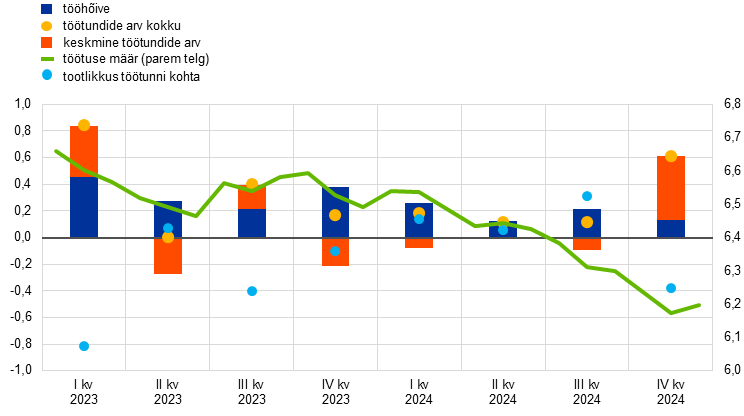 Euroala tööturg püsis 2024. aastal üldiselt stabiilne, ehkki tööhõive kasv on võrreldes viimaste aastatega aeglustunud, ja küsitlusnäitajad viitasid sellele, et tööturud jahtusid aasta jooksul. Töötuse määr kukkus jaanuarikuiselt 6,5%-lt detsembris 6,2%-le – see on üks madalaimatest näitajatest alates euro kasutuselevõtust ja 1,3 protsendipunkti võrra madalam kui 2020. aasta jaanuaris täheldatud pandeemiaeelne tase. Ka aasta viimases kvartalis oli töötuse määr keskmiselt 6,2% (joonis 1.5). Koguhõive ja töötundide koguarv olid majanduskasvuga üldjoontes kooskõlas ning kasvasid 2024. aastal 1%. Need muutused tõid kaasa tootlikkuse üldjoontes stabiilse arengu. Tööviljakuse kehv kasv oli enamasti tsükliline. See tulenes vähesest nõudlusest, samal ajal kui ettevõtted hoidsid varutööjõudu ehk neil oli nõrga majanduskasvu ajal palgal rohkem töötajaid kui vaja. Siiski võisid oma osa mängida ka struktuursed tegurid. Töötundide keskmine arv vähenes 2024. aastal 0,1% ja jäi aasta viimase kvartali seisuga pandeemiaeelsest tasemest 0,9% allapoole. Töötundide keskmise arvu areng kajastas jätkuvalt selliseid tegureid nagu 2023. aasta teisel poolel täheldatud varutööjõu hoidmine ja endiselt kõrge haiguspuhkuste tase. Tööjõus osalemise määr 15–74aastaste seas kasvas 2024. aasta kolmandas kvartalis 66%ni, olles pandeemiaeelsest tasemest 1,2 protsendipunkti kõrgemal. Tööjõu kasvule on kõige rohkem kaasa aidanud naised, vanemaealised töötajad, kõrgharidusega inimesed ja võõrtöötajad. Tööjõunõudlus oli võrreldes eelmiste aastatega 2024. aastal languses ja vabade töökohtade määr kukkus eelmise aasta neljandas kvartalis 2022. aasta teise kvartali tipptasemest veelgi allapoole 2,5%ni, kuid jäi pandeemiaeelsest tasemest ehk 2019. aasta viimase kvartali 2,3%st allapoole.[2] Nominaalpalkade inflatsioonile järelejõudmine soodustas tööhõive ja toodangu dünaamika kohandumist ning viis reaalpalgad tootlikkuse taastumisega paremini kooskõlla. Seega aitas EKP rahapoliitika oma keskpika perioodi suunitluse ja hinnastabiilsuse säilitamise piiramata jätmise teel toetada tööhõivet ja tootlikkust. Viimased kuuluvad Euroopa Liidu eesmärkide hulka, mille saavutamisele EKP saab kaasa aidata.