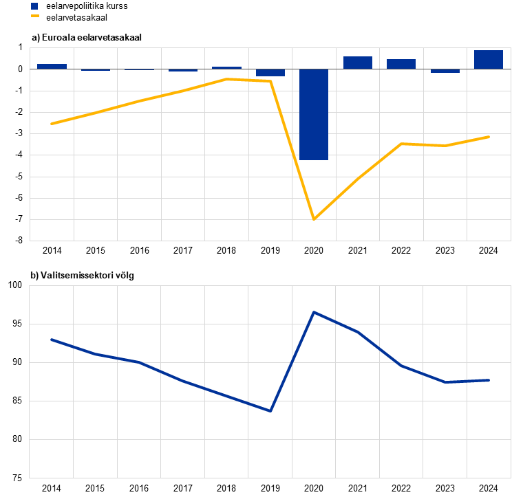 2024. aasta lõpus prognoositi eelarvepoliitika edasist karmistumist 2025. aastal, ehkki aeglasemas tempos kui varasematel aastatel. Seda eelarveväljavaadet peeti aga väga ebakindlaks. Poliitilised riskid tulenesid suurte euroala riikide eelarvekavadest, USA uue administratsiooni tulevastest otsustest ja Euroopa reaktsioonist. Need riskid lisandusid elanikkonna vananemisest tingitud pikaajalisele eelarvesurvele. Lisaks oodatakse üha enam, et eelarvepoliitika pakuks strateegilisi avalikke hüvesid, et tugevdada Euroopa majanduse vastupanuvõimet, tehes edusamme rohe- ja digipöördes ning suurendades majanduslikku julgeolekut ja kaitset. Rohe- ja digipöörde tarbeks annab suure panuse taasterahastu „Next Generation EU“, mis kestab 2026. aasta lõpuni (infokast 1).