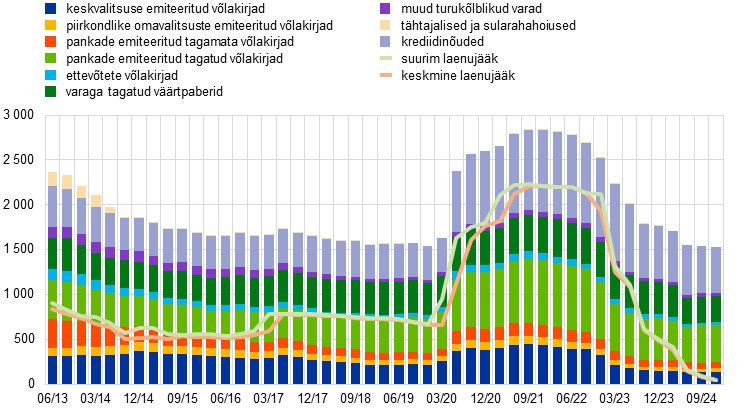 EKP baasintressimäärade langetamise tulemusel oli hoiustamise püsivõimaluse intressimäär 3,00% ja selle kumulatiivne langus 2024. aasta jooksul 100 baaspunkti. | Eurosüsteemi bilansimaht vähenes 0,5 triljoni euro võrra. See kajastas kolmanda seeria suunatud pikemaajaliste refinantseerimisoperatsioonide (TLTRO-III) lõppu, varaostukava portfelli vähenemist ning mõningal määral pandeemia majandusmõjude ohjeldamise erakorralise varaostukava raames osalistele reinvesteeringutele üleminekut. Need meetmed olid aeglase inflatsiooni ajastul ja pandeemia ajal väga tähtsad. |