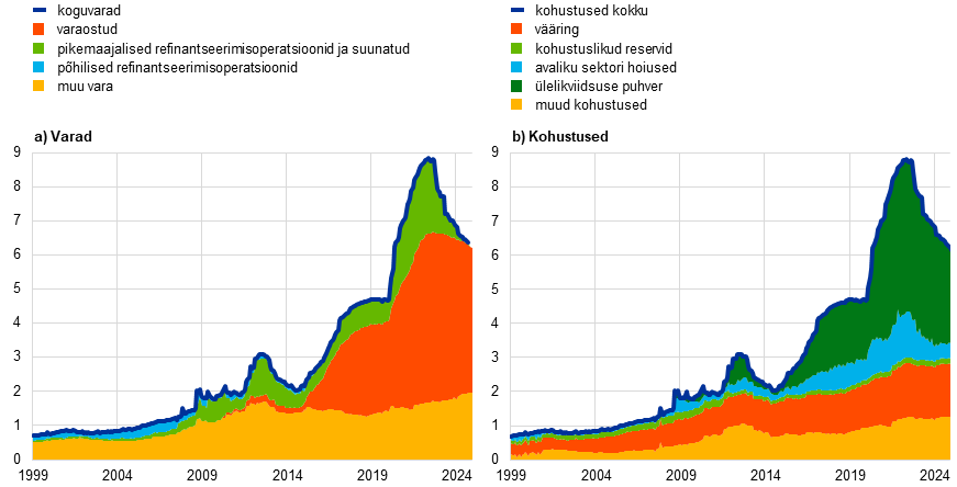 Ka meie bilansimaht jätkas 2024. aastal normaliseerumist, kahanedes poole triljoni euro võrra. Detsembri lõpus saavutasime kaks olulist eesmärki: kolmanda seeria suunatud pikemaajaliste refinantseerimisoperatsioonide raames pankadele laenatud vahendid maksti täielikult tagasi ning lõpetati pandeemia majandusmõjude ohjeldamise erakorralise varaostukava raames ostetud aegumistähtajani jõudnud väärtpaberitelt laekuvate põhiosa tagasimaksete reinvesteerimine.