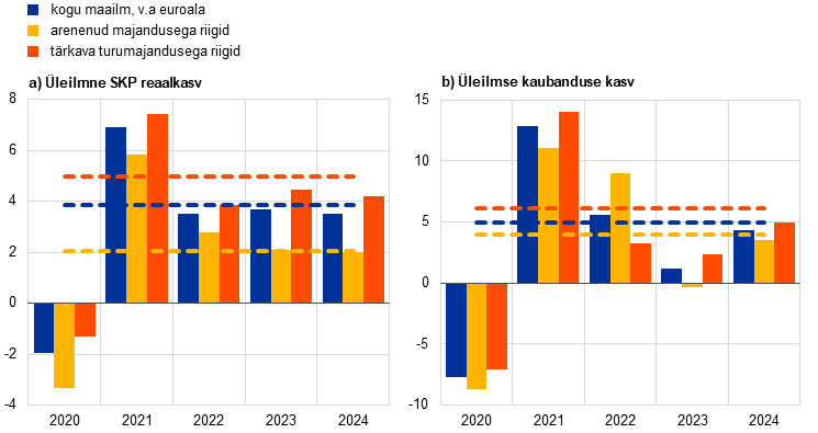 Märkus. Osa a: „üleilmne SKP“ ei hõlma euroala. Koondnäitajad arvutatakse ostujõu pariteediga korrigeeritud SKPd kasutades. Osa b: üleilmse kaubanduse kasv on üleilmse (sh euroala) impordi kasv. Mõlemas osas tähistavad katkendjooned pikaajalisi keskmisi vahemikus 1999–2023. Viimased andmed pärinevad 2024. aastast ja neid ajakohastati 28. märtsil 2025.