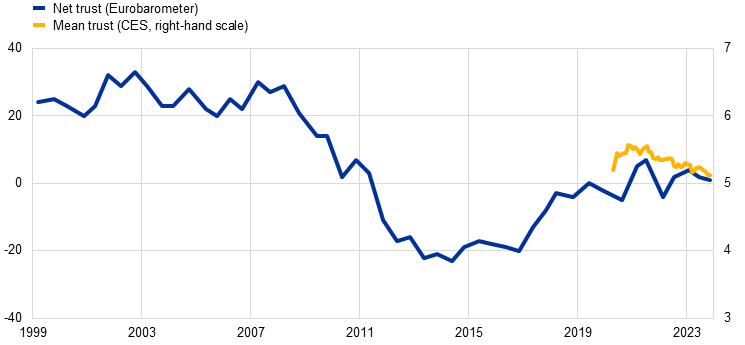 Notes: Standard Eurobarometer data cover survey waves 51 (spring 1999) to 100 (autumn 2023). Net trust is the percentage of respondents answering “tend to trust” minus the percentage answering “tend not to trust”. Respondents who answered “don’t know” are disregarded. CES data are a weighted average and cover monthly survey waves from April 2020 to December 2023. The CES trust question is answered on a scale of 0 to 10 (with 0 being no trust at all and 10 being complete trust).