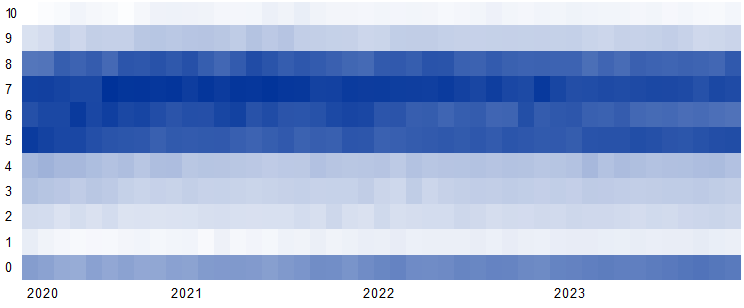 Notes: Weighted CES estimates covering monthly survey waves from April 2020 to December 2023. The cell shading reflects the share of respondents in a given survey wave (month) that had the level of trust in the ECB shown on the scale. A darker shade represents a larger share of respondents – for example, the highest share is seen in September 2020, when 17% of respondents reported a trust level of 7.
