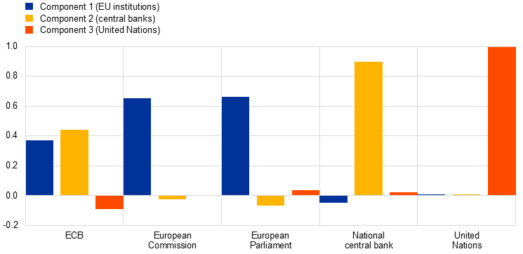 Principal component analysis suggests the presence of underlying associations with other EU institutions and central banks which have an impact on trust in the ECB. To simplify the interpretation of the components in a PCA which capture the variation in the original data, they can be rotated. These rotations are transformations of the original components which aim to achieve a simpler structure of loadings in order to more easily interpret patterns between variables.[29] These rotated components indicate that levels of trust in the ECB are influenced by broader trust developments for EU institutions and central banks (Chart 7). Component 1 puts a heavy loading on trust in the European Parliament (0.66) and the European Commission (0.65), and partially on trust in the ECB (0.37), suggesting the existence of an “EU factor”. Component 2 loads heavily on trust in the national central bank (0.90) and partially on trust in the ECB (0.44), indicating a “central bank factor”. A third component primarily relates to levels of, and changes in, trust in the United Nations (1.00).[30] This is tentative evidence of both a European dimension and a central banking dimension in the evolution of trust in the ECB.[31]
