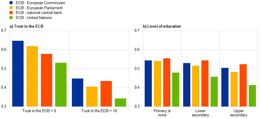 Trust in the ECB appears to co-move with, or even reflect, trust in central banks and EU institutions more broadly. Within the universe of national and international policymaking institutions, the unique structure of the Eurosystem and the ECB’s mandate and objectives mean the ECB has characteristics in common with both national central banks and other European institutions. Particularly for respondents with less formal education, the distinction between institutions may not be clear, and may lead to a high correlation of trust for very different institutions (see also Box 2). Individuals may also show distrust in institutions in general, even when aware of their different mandates.[24] It is therefore important to understand the extent to which trust in the ECB is associated with trust in other institutions and the extent to which it is ECB-specific.[25]