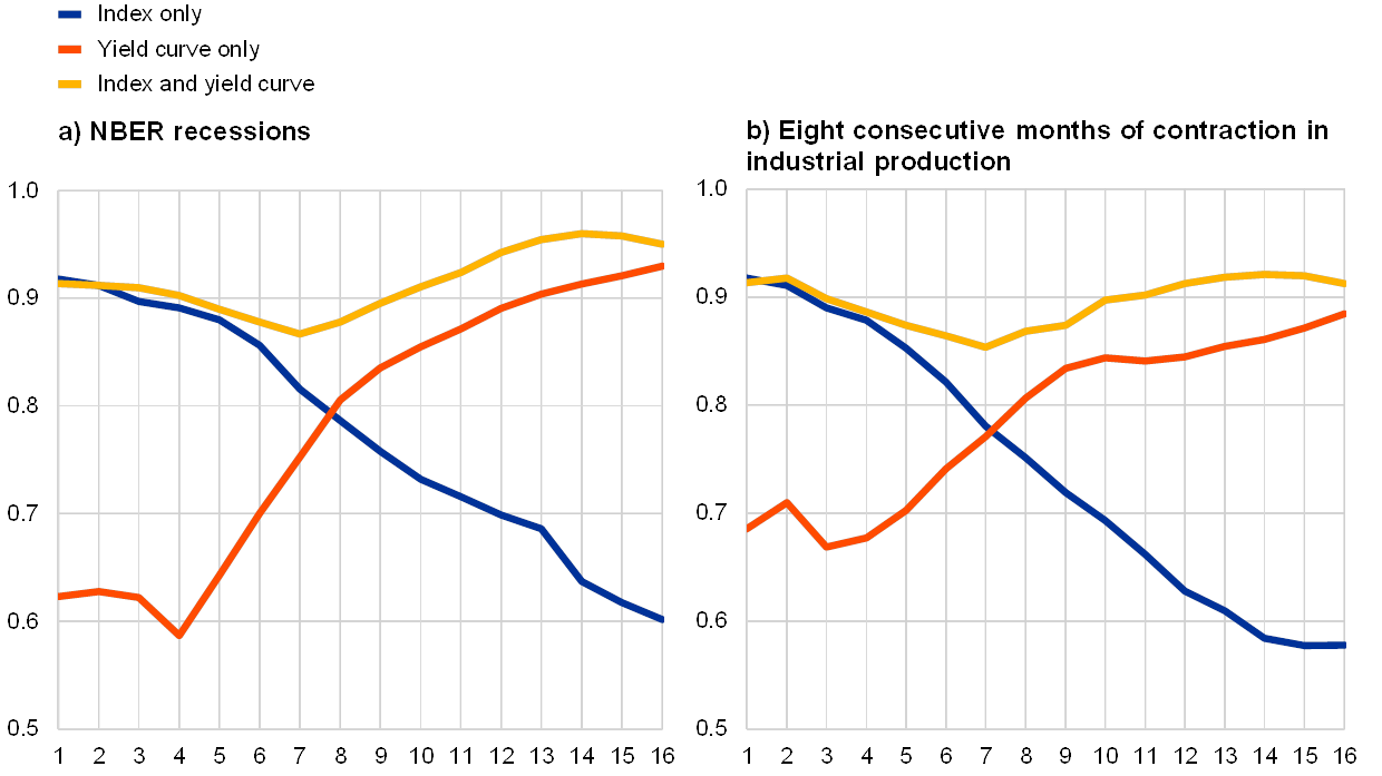 where the probability of a recession at the future horizon ( t + k ) is forecast by the slope of the yield curve at the present horizon (the difference between short-term and long-term yields), which is a standard predictor of recession, and the text-based indicator.[4] The index provides additional information on the slope of the US yield curve. The goodness of fit of recession probability models is summarised by the so-called receiver operator curve (ROC), which can be seen as a measure of the accuracy of the predictions made using the model.[5] The ROC statistic is reported in Chart B and shows that the specification applying the newspaper article-based index is superior to the simple yield curve at short horizons. The inclusion of newspaper article data in the estimation significantly improves the performance of the model. This assessment is robust to a definition of recession other than that used by the NBER (whereby a recession is defined as eight consecutive months of contraction in industrial production) and to exclusion of the global financial crisis period.