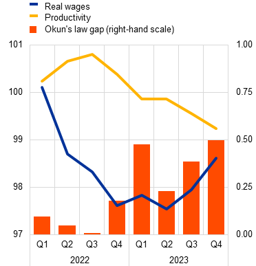 Notes: Panel b) shows real wages deflated by the private consumption deflator. When using the GDP deflator, the gap between productivity and real wages remains positive but is quantitatively smaller and closes in the fourth quarter of 2023. Productivity is measured as output per worker. The red bars show the deviations (in percentage points) from Okun’s law. The latest observations are for the fourth quarter of 2023.