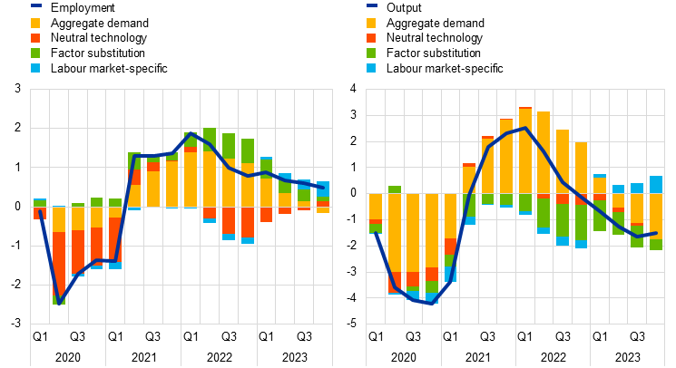 Notes: The lines depict the year-on-year growth rates of employment (left panel) and output (right panel) in terms of deviation from their respective deterministic component. The bars show the percentage point contribution of each shock. A description of the economic meaning of each shock is provided in the main text. The latest observations are for the fourth quarter of 2023.