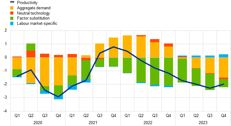 Notes: Productivity is measured as output per worker. The line depicts year-on-year productivity growth in terms of deviation from the deterministic component. The bars show the percentage point contribution of each shock. The latest observations are for the fourth quarter of 2023.