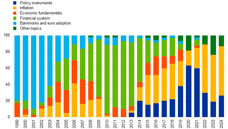 Notes: The communication outlets considered in this chart include the press conferences following the Governing Council’s monetary policy meetings, related press releases, the accounts of the Governing Council’s monetary policy meetings and speeches given by the ECB’s President. The Monthly Bulletin and the Economic Bulletin are excluded, as the Monthly Bulletin is only available in PDF format, which makes it unsuitable for topical data filtering. The latest observation is for June 2024.