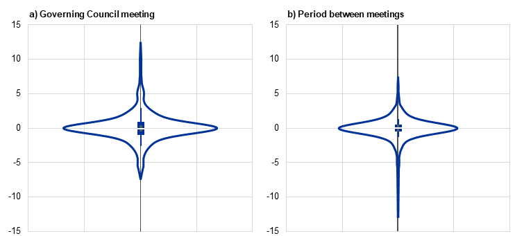 Consistent with the literature, the distribution of yield impacts triggered by monetary policy press releases and press conferences exhibits “fat tails”.[4] Yield responses to monetary policy announcements are generally small, but significant announcements lead to substantial asset price reactions, resulting in a fat-tailed distribution. This can be seen from panel a) in Chart B, where the width at each point of the “violin” plot reflects the density of the data. Most values are concentrated around zero and the thin tails indicate occasional, larger responses. The “fat tails” are an even more pronounced feature in the distributions of the impact of communication between meetings, owing to the more muted market reaction in general and fewer significant events, despite some important events occurring between meetings that have a very high market impact in the tails of the distribution.[5]