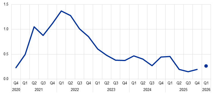 The employment outlook remained lacklustre amid a strong focus on cost-cutting and increasing AI-enabled work process optimisation. Firms in parts of the manufacturing sector, particularly in the chemicals and automotive industries, and mainly in core euro area countries, continued to make sizeable job cuts owing to sustained weak demand, high costs and intensifying import competition. Companies in these sectors were consolidating production, relocating functions to lower cost regions and restructuring white-collar and R&D roles, drawing on AI tools and automation to reap efficiency gains. By contrast, contacts in consumer services, particularly in hospitality and air travel, reported rising employment tied to growing demand. In most other sectors, contacts reported employment being rather flat, in part because the increasing integration of AI into work processes had enabled businesses to grow without needing more staff. AI was also reshaping and replacing some white-collar roles, resulting in a difficult job market for graduates. Recruitment challenges persisted, however, for many specialised roles, particularly in sectors such as energy, construction, cybersecurity, aerospace and defence. Placement agencies said that temporary placement activity seemed to have reached a trough, but permanent hiring had continued to fall. The consensus outlook for 2026 was for a return to modest staffing growth, but there were no clear indications this had yet begun.