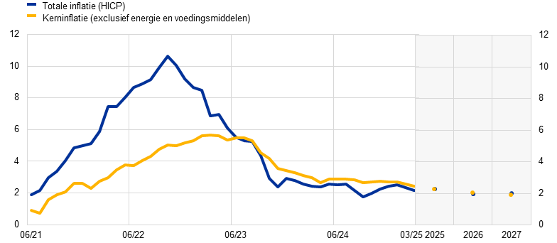 De ECB is vastbesloten ervoor te zorgen dat de totale inflatie zich duurzaam stabiliseert op de doelstelling van 2% op middellange termijn. De restrictieve monetairbeleidsmaatregelen hebben ertoe bijgedragen dat de totale inflatie duurzaam terugkeert naar de doelstelling van 2% op middellange termijn, zoals blijkt uit recente macro-economische projecties van medewerkers voor het eurogebied. De kerninflatie – de totale inflatie exclusief energie en voedingsmiddelen – daalde van 2,6% in februari 2025 naar 2,4% in maart 2025. Het algehele desinflatieproces bestaat uit elkaar versterkende ontwikkelingen in de totale inflatie en de kerninflatie. Lagere totale inflatie vermindert de behoefte van mensen om de inflatie te compenseren en draagt zo bij tot een matiging van de loongroei. Dit vermindert ook de noodzaak om goederen te herbeprijzen. Naarmate de totale inflatie afneemt, zal de kerninflatie matigen en vervolgens weer de totale inflatie verder doen dalen. Bovendien wordt de terugkeer naar de doelstelling ondersteund door het aanhoudende effect van de eerdere verkrapping van het monetair beleid op de consumptieprijzen en door de inflatieverwachtingen op langere termijn die stevig verankerd blijven rond de doelstelling. Vooral in het licht van de huidige toenemende onzekerheid zal de Raad van Bestuur een op data gebaseerde benadering per vergadering volgen om de passende monetairbeleidskoers te bepalen. De Raad zal de rentebesluiten in het bijzonder baseren op zijn beoordeling van de inflatievooruitzichten, de dynamiek van de onderliggende inflatie en de kracht van de monetairbeleidstransmissie. De Raad van Bestuur legt zich dus niet bij voorbaat vast op een bepaald rentetraject. Bij het vaststellen van de basisrentetarieven zal een evenwicht moeten worden gevonden tussen het risico van een te snelle verlaging van de rente – waardoor de inflatie zou kunnen stijgen – en het risico van te trage versoepeling, wat de economische bedrijvigheid en de werkgelegenheid onnodig zou schaden, en tot een te lage inflatie zou kunnen leiden.
