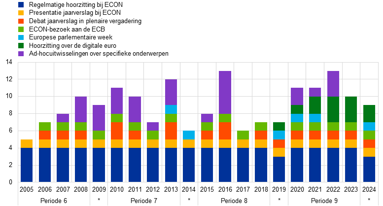 De ECB hecht grote waarde aan de wederzijds voordelige verantwoordingsrelatie met het Europees Parlement. De verantwoordingsverplichtingen van de ECB zijn vastgelegd in het primaire EU-recht. In de loop der jaren heeft de ECB met het Europees Parlement samengewerkt om haar verantwoordingsplicht ver buiten de in het Verdrag vastgelegde vereisten te versterken. In dit verband hebben de president van de ECB en de voorzitter van het Europees Parlement in juni 2023 een briefwisseling ondertekend waarin verantwoordingskanalen worden gespecificeerd en een gemeenschappelijke interpretatie wordt gegeven van de verantwoordingspraktijken op het gebied van centraal bankieren. Tijdens de laatste zittingsperiode van het Parlement heeft de ECB zelfs vaker contact gehad met het Europees Parlement dan in eerdere zittingsperioden (Grafiek 4). Naast de controlerende functie van het Europees Parlement waardeert de ECB ook de kans om haar beleid uit te leggen aan burgers en hun gekozen vertegenwoordigers, en om hun mening te horen. Dit vergroot de transparantie, geloofwaardigheid en effectiviteit van het beleid van de ECB. De ECB blijft zich daarom volledig inzetten bij haar inspanningen op het gebied van verantwoording en transparantie en streeft ernaar de interactie met het Europees Parlement te blijven verbeteren, overeenkomstig de bepalingen van het primaire EU-recht.