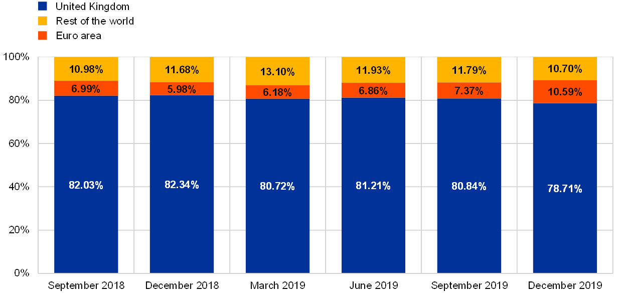 Reliance is very pronounced in derivatives clearing. As at December 2019, almost 80 per cent of all euro area clearing members’ OTC derivatives positions were cleared through UK CCPs (Chart A.1). Large investment banks operating out of London also play a significant role in euro area bilateral OTC derivatives markets. As at August 2019, over a quarter of uncleared OTC derivatives held by euro area counterparties were sourced from the UK (Chart A.2). While issues related to uncleared OTC derivatives are unlikely to create financial stability risks in a no-deal scenario, the activities of some of these institutions are still relevant to the provision of liquidity to euro area markets over the longer term.[1] Large investment banks are in the process of implementing contingency plans with a view to continuing to service EU clients.