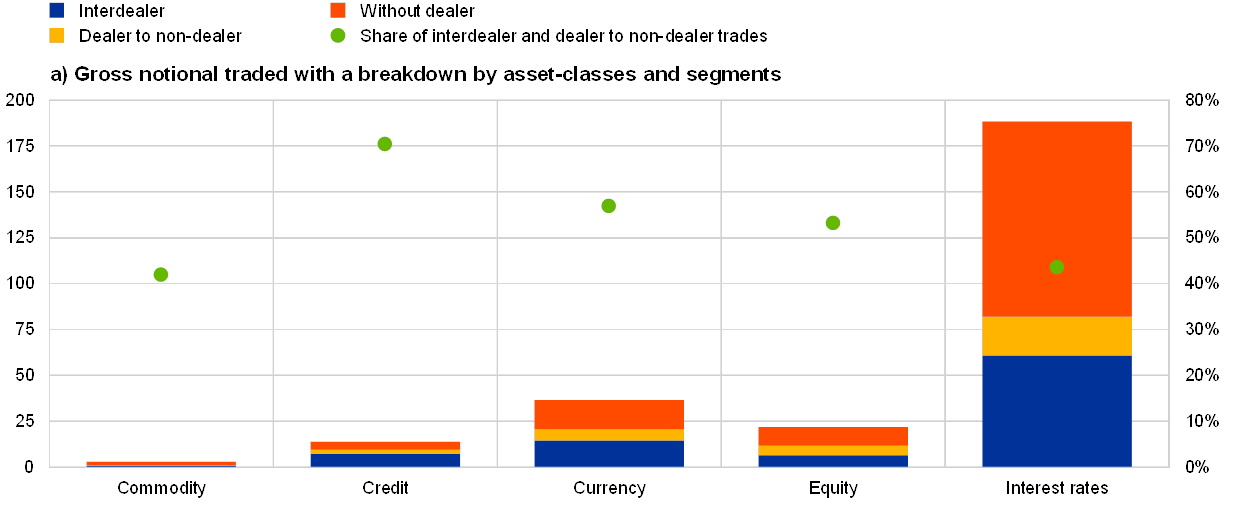 Sources: EMIR data and ECB calculations. The analysis is carried out based on outstanding positions as at Q3 2019 and includes trades cleared to CCP via clearing members. According to Commission Delegated Regulation 151/2013, European (euro area or national) authorities have access to trades where at least one counterparty is resident in the EU (euro area or specific country), to trades where the reference entity is resident in the EU (euro area or specific country) and to trades where the underlying instrument is sovereign debt of a European (euro area or specific) country.Notes: Panel (a): the chart reports the gross notional traded as at September 2019 with a breakdown by asset class and segments (y-axis: left-hand side in trillion, right-hand side in percentages; x-axis: breakdown by asset classes). We distinguish three segments: “Interdealer” refers to trades where both counterparties are G16 dealers, “Dealers to non-dealers” refers to trades where one of the two counterparties of the trade is a G16 dealer and the other belongs to other sectors, “W/o dealers” refers to trades occurring between non-G16 dealer counterparties (e.g. CCP, investment funds, insurance companies, non-G16 banks, pension funds, non-financial corporations and other financial institutions). Panel (b): the chart reports the breakdown by asset class and G16 dealers’ domicile as share of gross notional traded as at September 2019, dots indicate UK-domiciled dealers as share of net notional (y-axis: in percentages; x-axis: breakdown by asset classes).