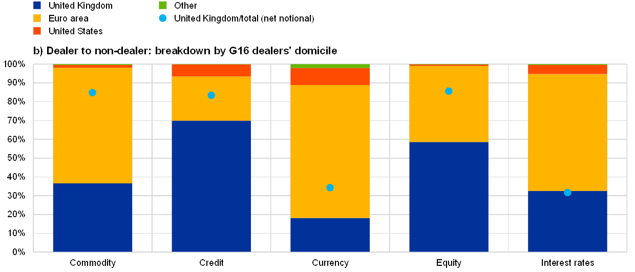 Many G16 dealers currently serve the euro area market out of London. In this context, the liquidity provision of UK-based dealers is quite heterogeneous across asset classes (Chart A, panel (b)).[17] In gross notional terms, UK-based dealers are prominent in credit derivatives, which is a smaller market, while their role in interest rate derivatives is more limited. Compared with euro area dealers, they tend to take larger net exposures, especially for commodity, credit and equity derivatives (net notional, see dots in Chart A, panel (b)).[18] Since dealers typically do not take substantial and persistent net exposures, this could indicate that UK dealers may be offsetting the large net exposures they hold vis-à-vis euro area counterparties with other global dealers. This may reflect the role of UK-based dealers as intermediaries between the euro area and the rest of the world.