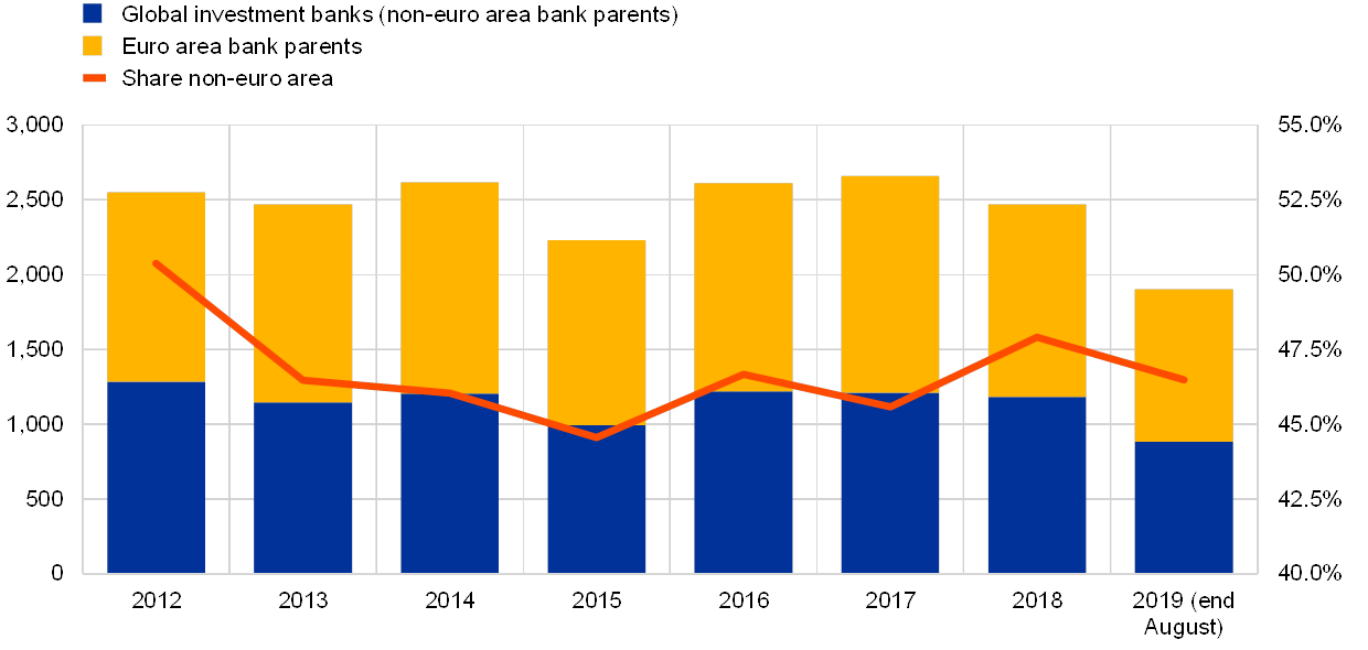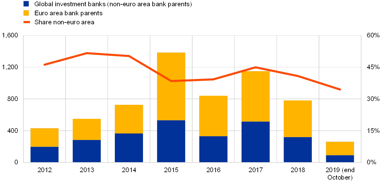 Source: Dealogic.Notes: Banks involved in deals as lead bank are categorised as “euro area” or “global”, depending on the location of the parent. Prior to Brexit, global banks typically accessed the market from London. Bars reflect the total number of deals individual banks participated in. As many banks typically participate in a single deal, this may entail double-counting of deals in total left-hand side axis figures. The red line is the ratio between the blue and yellow bars can be taken as a proxy for the relevance of global banks to the euro area market.