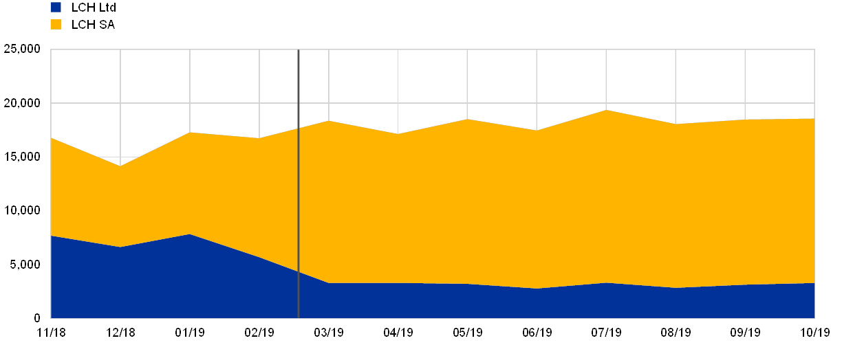 So far, the main relocation operation from the UK to the euro area in terms of clearing has fostered further market efficiencies. In February 2019, a concerted effort between repo dealers and the two LCH CCPs in London and Paris (both owned by the London Stock Exchange Group) led to the relocation of the near-totality of euro-denominated repo clearing from the UK to France. In the eight months following this relocation, the average monthly value of cleared repo trades at LCH SA (Paris) increased to €15.1 trillion from €8.3 trillion in 2018, while at LCH Ltd it dropped from €8.1 trillion to €3.2 trillion (see Chart A), around 90% of which being repos on sterling-denominated gilts.[11] Euro-denominated repos are now cleared almost exclusively at euro area CCPs (largely at LCH SA)[12], enabling additional market efficiencies including balance sheet netting and access to TARGET2 -Securities.