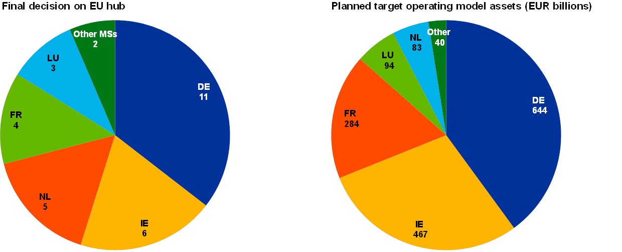 This complex mix of incentives will eventually be reflected in the emerging structure of the euro area financial system. According to preliminary evidence on the relocation plans of banks, a small number of “hubs” and some degree of activity concentration could emerge (see also Box A.2). Based on market intelligence, this pattern also seems to be confirmed for relocation activities beyond banking. A sizeable fraction of asset management firms and insurance companies affected by Brexit are planning to move to Ireland and Luxemburg or have already done so. The Netherlands, meanwhile, is mainly attracting firms such as trading platforms, exchanges and fintechs. If these dynamics are confirmed, and the multi-centric structure of the euro area financial system becomes more pronounced, it will be crucial to implement policies that foster an efficient interaction between different hubs (see Section 4). Such a multi-centric financial system would reduce concentration risks.