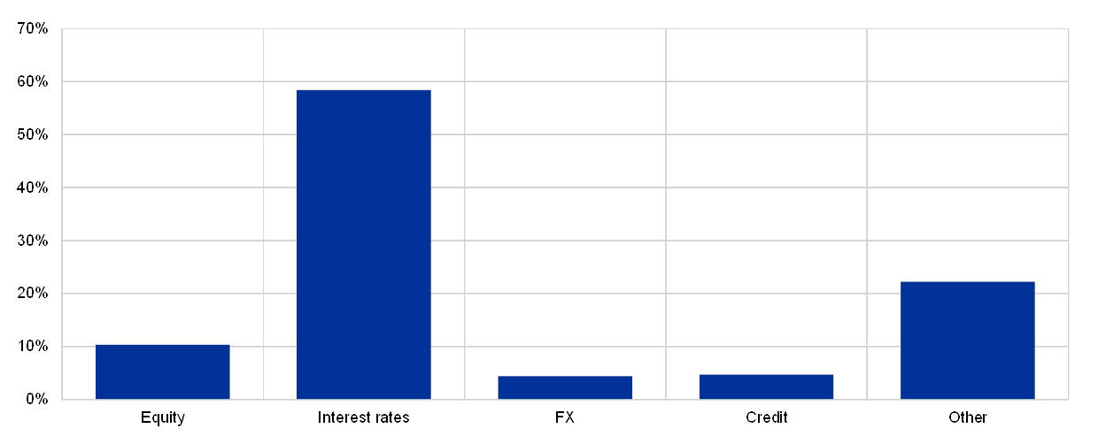 Source: ECB estimates on EMIR data.Notes: Shares based on mid-point of upper and lower bound estimates. Under the EMIR reporting regime, there is an obligation for both counterparties to a derivative contract to report the trade (“double-sided reporting”). Due to misreporting and underreporting, not all trades can be matched, i.e. there are unpaired trades. The assumption that all unpaired trades are the result of underreporting leads to an “upper bound” estimate of the uncleared derivatives exposures. Conversely, the assumption that all unpaired trades are the result of misreporting leads to a “lower bound” estimate. Data as at 29 August 2019.