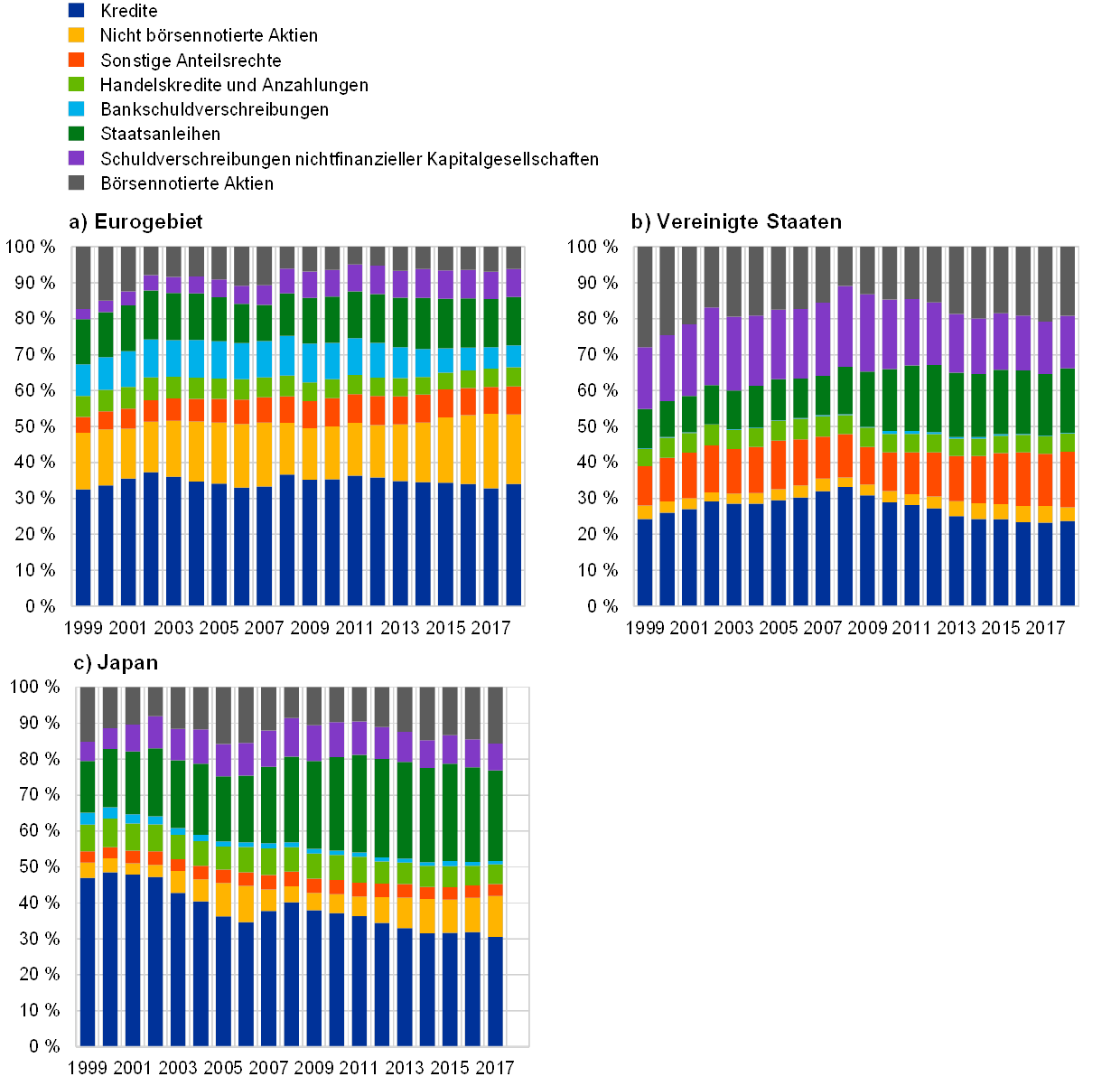 Finanzierungsstrukturen der Wirtschaft des Eurogebiets, der USA und Japans (nach Art des Instruments)