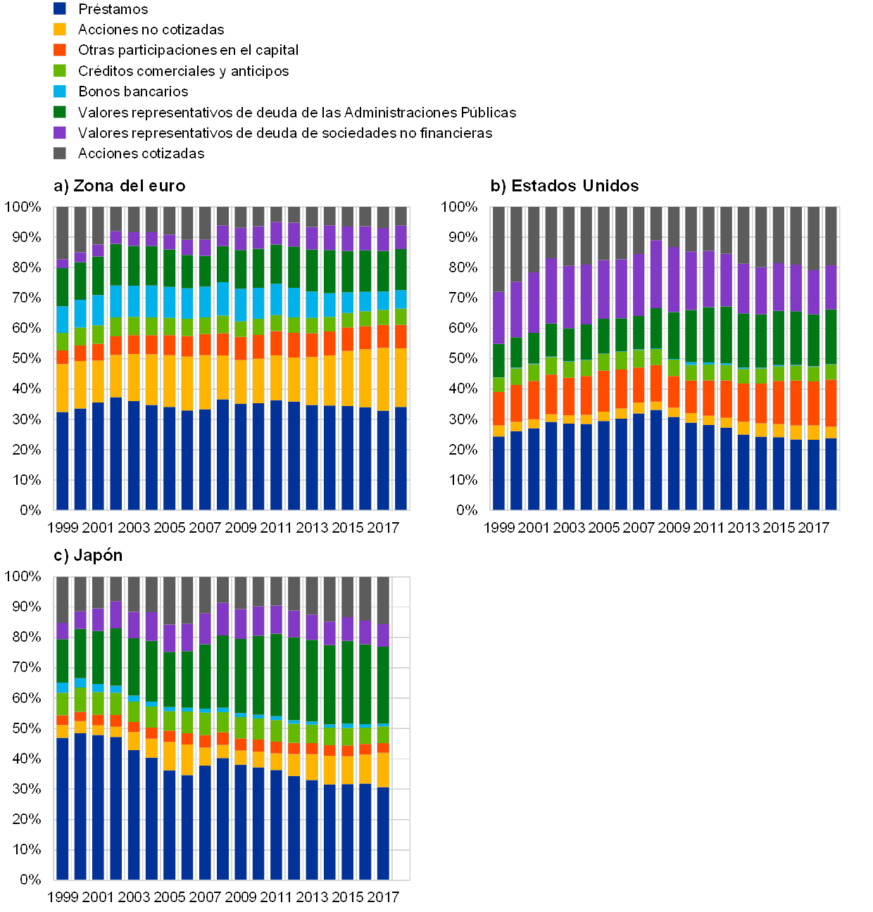 En cuanto a las funciones de los distintos mercados financieros, la estructura financiera de la zona del euro se caracteriza por mantener la dominancia de los instrumentos de financiación no negociables, como los préstamos y las acciones no cotizadas. La segunda forma de describir la estructura financiera mediante la combinación de mercados consiste en tener en cuenta la importancia relativa de los diferentes instrumentos de financiación utilizados por los principales sectores económicos. En el gráfico 1.2 se especifican los porcentajes relativos de los principales instrumentos financieros (recogidos en el balance) en la financiación agregada de todos los sectores económicos (hogares, empresas y gobiernos, pero excluido el sector exterior) en la zona del euro, Estados Unidos y Japón. Los tres paneles muestran algunas diferencias tangibles, que coinciden con la opinión generalizada de que los sistemas financieros de Europa y Japón se basan en mayor medida en las entidades de crédito y el de Estados Unidos en el mercado de capitales. En la economía de la zona del euro, el porcentaje de financiación a través de préstamos y acciones no cotizadas es especialmente elevado y, en la economía japonesa, prevalece la financiación mediante préstamos y valores representativos de deuda de las Administraciones Públicas. La economía estadounidense se financia a través de acciones cotizadas y de valores representativos de deuda de sociedades no financieras en mayor medida que la zona del euro o Japón (aunque el porcentaje de préstamos y otras participaciones en el capital no es insignificante).