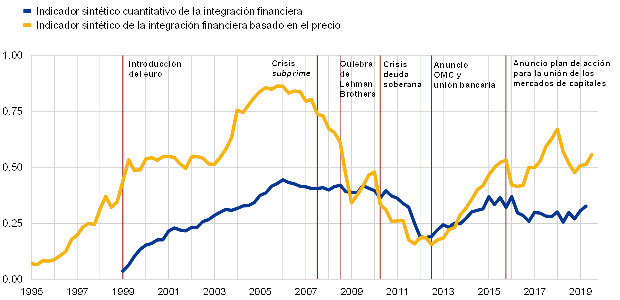 Fuente: BCE y cálculos del BCE.Notas: El indicador sintético basado en el precio agrega diez indicadores para los mercados monetarios, de valores de renta fija, de valores de renta variable y de banca minorista, mientras que el indicador sintético cuantitativo agrega cinco indicadores para los mismos segmentos del mercado, salvo la banca minorista. Los indicadores están comprendidos entre cero (fragmentación total) y uno (integración plena). Los aumentos de los indicadores señalan una mayor integración financiera. A partir de enero de 2018, el comportamiento del indicador basado en el precio puede haber variado debido a la transición del eonia al €STR en el componente del mercado monetario. OMC significa operaciones monetarias de compraventa. Para obtener una descripción detallada de los indicadores y sus inputs, véanse el anexo estadístico de este informe publicado en el sitio web y Hoffmann, P., Kremer, M. y Zaharia, S. (2019), «Financial integration in Europe through the lens of composite indicators», Working Paper Series, n.º 2319, BCE, septiembre.