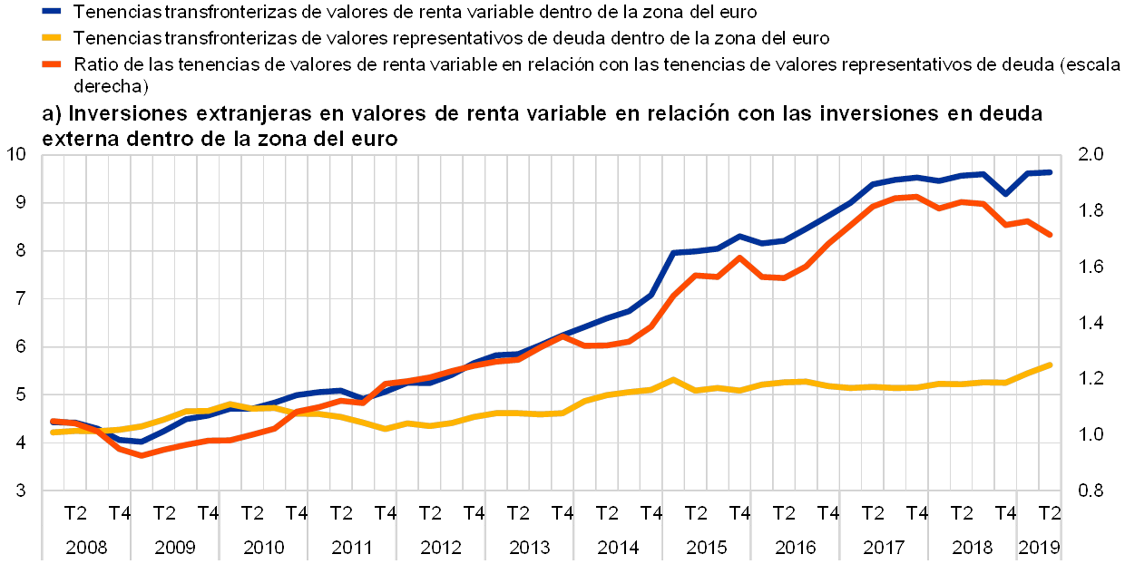 Tras la fuerte tendencia a la reintegración después de la crisis en la zona del euro hasta 2015, la evolución dispar en la integración financiera general desde entonces se ha caracterizado por la notable volatilidad en la convergencia de precios y el estancamiento del crecimiento de la inversión transfronteriza. Cuanto más avance la integración financiera en los países de la zona del euro, más se podrá hablar de un mercado único de servicios financieros, y más adecuado será examinar la estructura y la evolución financieras en la zona del euro en su conjunto. Los dos indicadores sintéticos de la integración financiera que se muestran en el gráfico 1.3 y que tienen por objeto aproximar la imagen general de la integración financiera de la zona del euro, combinando la información procedente de los mercados financieros más importantes, todavía apuntan a discrepancias entre la integración reflejada en los diferenciales de precios transfronterizos (el indicador basado en el precio en amarillo) y la integración reflejada en la inversión transfronteriza (el indicador cuantitativo en azul). Tras las crisis financiera y de la deuda soberana, ambos experimentaron una considerable recuperación hasta 2015. Sin embargo, con posterioridad el indicador basado en el precio mostró importantes fluctuaciones y, según los últimos datos, se encuentra ligeramente por encima del máximo registrado en 2015. Esta volatilidad se debió, en particular, a la variación de los diferenciales de los rendimientos de los bonos transfronterizos, relacionada con la aparición y la desaparición de incertidumbres políticas en varios países de la zona del euro, entre otros factores. A pesar de los efectos positivos, en general, de la política monetaria expansiva del BCE sobre la integración financiera, desde 2015 el indicador sintético cuantitativo se vio contenido especialmente por el moderado nivel de préstamos interbancarios transfronterizos, ya que la inyección de exceso de reservas derivada de medidas de política monetaria no convencionales —como cabía esperar— redujo las necesidades de efectivo de las entidades de contrapartida. El ligero repunte del indicador cuantitativo en la última observación, que lo situó en niveles similares a los registrados en 2004 y 2015, se vio impulsado por la recuperación en las tenencias de bonos y los préstamos interbancarios transfronterizos. Un indicador relacionado con la financiación transfronteriza en la zona del euro, publicado por la Asociación de Mercados Financieros de Europa, que se basa en un conjunto más amplio de segmentos del mercado y que, por tanto, está menos influido por un único componente, muestra, no obstante, una recuperación posterior a la crisis más continua también en lo que a cantidades se refiere[4].