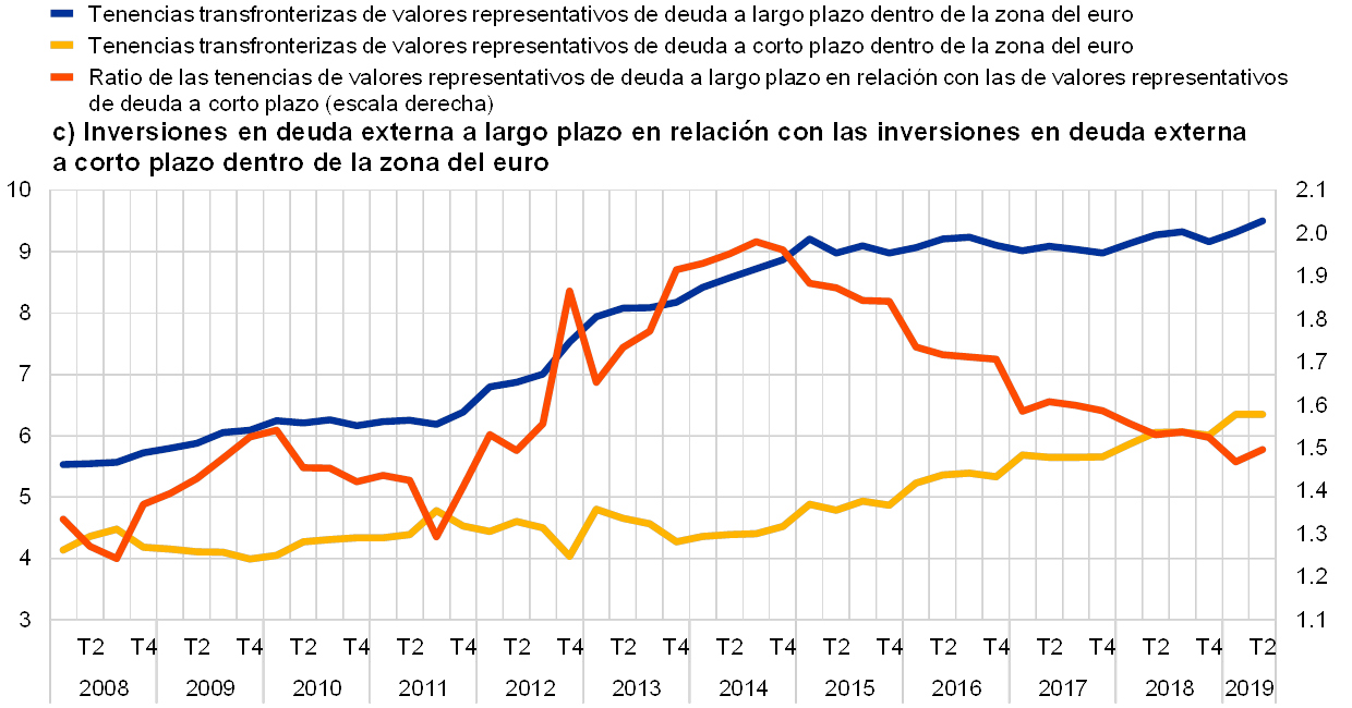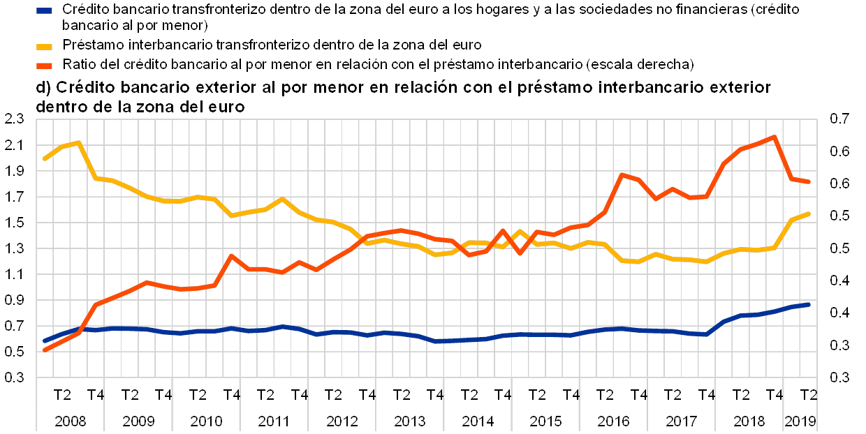 Fuentes: a) BCE y cálculos del BCE; b) BCE; c) BCE, cálculo del BCE basado en datos de la balanza de pagos y Eurostat; d) BCE.Notas: a) La línea azul muestra el importe total de las tenencias de valores de renta variable por parte de inversores de la zona del euro (todos los sectores) emitidos por residentes de otros países de la zona del euro. La línea amarilla muestra el importe total de las tenencias de valores representativos de deuda por parte de inversores de la zona del euro (todos los sectores) emitidos por residentes de otros países de la zona del euro. La línea naranja muestra la ratio de ambas. En el caso de las inversiones en valores de renta variable y en valores representativos de deuda, el total se refiere a la suma de las tenencias de activos transfronterizos y nacionales dentro de la zona del euro. b) La línea azul muestra el importe total de la inversión extranjera directa dentro de la zona del euro. La línea amarilla muestra la suma de la inversión extranjera directa dentro de la zona del euro y la inversión de cartera transfronteriza dentro de la zona del euro. La línea naranja muestra la ratio de ambas. c) La línea azul muestra el importe total de la deuda a largo plazo (con vencimiento superior a un año) emitida por los países de la zona del euro y mantenida por residentes de otros países de la zona del euro. La línea amarilla muestra el importe total de la deuda a corto plazo (con vencimiento inferior a un año) emitida por los países de la zona del euro y mantenida por residentes de otros países de la zona del euro. La línea naranja muestra la ratio de ambas. d) La línea azul muestra el importe total del crédito bancario transfronterizo dentro de la zona del euro a los hogares y a las sociedades no financieras, es decir, el crédito bancario al por menor. La línea amarilla muestra el importe total de préstamos transfronterizos dentro de la zona del euro entre IFM, es decir, los préstamos interbancarios. La línea naranja muestra la ratio de ambos. Para ahondar en el análisis de la interpretación de estos indicadores, véase la Sección Especial A «Financial integration and risk sharing in a monetary union» del informe del BCE de 2016 titulado «Financial integration in Europe».