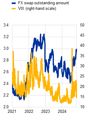 The EUR/USD FX swap market is large, and its short maturities and high degree of market concentration pose rollover risks. With a daily trading volume of €250 billion and €3 trillion of gross outstanding amounts, the euro area FX swap market is another major source of US dollars. Global recession fears, higher interest rates and the growing profitability of carry trades increased demand for US dollars via FX swaps sharply in 2022, before it started to gradually revert towards previous levels and then picked up again in autumn (Chart C, panel a). The FX swap market is highly concentrated, with the top four euro area dealers accounting for about 60% of the market, up from 50% five years ago. Similar to repos, the bulk of FX swap trading volumes are short-term. In the second quarter of 2024, 55% of transactions had a maturity of one day. The short-term nature of this market, combined with high market concentration, implies that liquidity can dry up quickly for counterparties without direct access to sources of US dollar funding. Moreover, as the payment obligations are recorded off-balance-sheet, it is more challenging for policymakers to anticipate the scale of US dollar rollover needs.