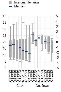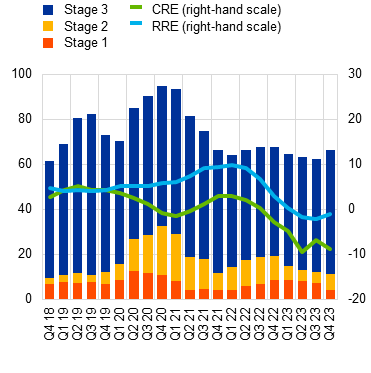 There are signs of deterioration in the asset quality of euro area banks, notably in CRE portfolios. While banks’ non-performing loan ratios remained at historically low levels just above 2% in 2023, there have been nascent signs of rising losses on a subset of loan portfolios that are more sensitive to cyclical downturns. In fact, CRE loan books have been the main driver of asset quality deterioration, reflecting both the downturn in euro area CRE markets and spillovers from the ongoing correction in US CRE markets to euro area banks with material exposures. That said, these portfolios are generally modest in size and should not have a systemic impact on the banking sector. For some banks with above-average CRE exposure, though, a marked deterioration in CRE asset quality could pose challenges. At the same time, the credit risk outlook for household and corporate portfolios remains tilted to the downside, as macro-financial conditions are weak and borrowers are increasingly feeling the impact of higher interest rates. As a result, banks may face the risk of higher provisioning costs if risks in the non-financial sectors materialise, not least because collateral values may not to be fully reflected in banks’ balance sheets.