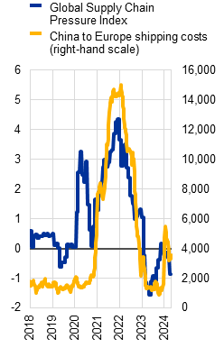 Geopolitical tensions have risen, posing risks to the global growth outlook and the euro area disinflation process. Russia’s war against Ukraine and the conflict in the Middle East are key sources of tail risk. The recent attacks on cargo ships on the Red Sea trade route triggered an abrupt rise in shipping costs between Asia and Europe in December 2023 (Chart 1.2, panel b) and global supply chain pressures have been on the rise since last autumn. The immediate risks to inflation and growth in the euro area from the Red Sea attacks seem limited owing to their minimal impact on oil production costs, current spare capacity in global shipping and subdued global demand. However, the impact on euro area growth and inflation could be substantial if the disruptions were to escalate to the broader region and last longer. The recent intensification of the Iran-Israel conflict has increased the probability of such a tail-risk scenario materialising. The expected reduction in oil production by its main exporters, as well as supply disruptions to oil and gas facilities in Russia and Ukraine, pose further upside risks to oil and gas prices. The rise in geopolitical tensions between major economies in recent years is also leading to weakening global trade links. For example, the share of imports to the United States from China declined from 25% in 2017 to 15% in 2023, and the number of protectionist measures targeting cross-border trade is increasing globally (Chart 1.2, panel c). Continued geopolitical tensions pose the risk of economic and financial fragmentation in the world economy, with potential adverse effects on financial stability in the euro area and globally. These potential effects could include slower productivity growth and higher production costs resulting from less efficient resource allocation, greater macro-financial volatility due to reduced international risk-sharing opportunities, and lower profitability and a higher cost of funding for financial institutions on the back of reduced cross-border capital flows. In this context, the record number of elections due to take place across the world in 2024 are likely to keep the uncertainty around global economic policies elevated.